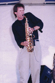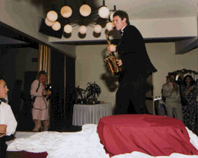 He plays along with Light Jazz, New Age and Blues during dinner and while people are mingling. Occasionally roaming from table to table. Then he can get wild and crazy to Rock, Techno and Dance while spinning on the dance floor, jumping into a split, sliding across the floor, or breathing fire out of his sax!
